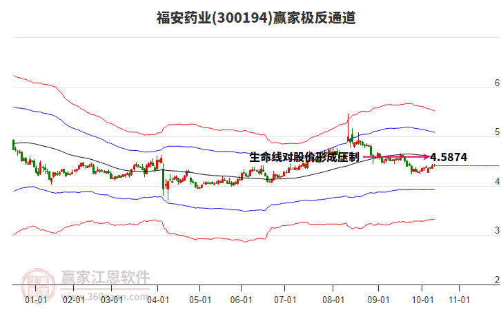 依據(jù)贏家江恩系統(tǒng)趨勢工具極反通道分析判斷福安藥業(yè)300194運行在生命線以下弱勢區(qū)域,根據(jù)規(guī)則該股短線輕倉參與,股價跌至弱勢外軌線后波段再結(jié)合其它工具信號建倉。應用口訣是:生命線上強勢走,生命線下難抬頭;紅黃兩條外軌線,壓力支撐顯勢頭。
