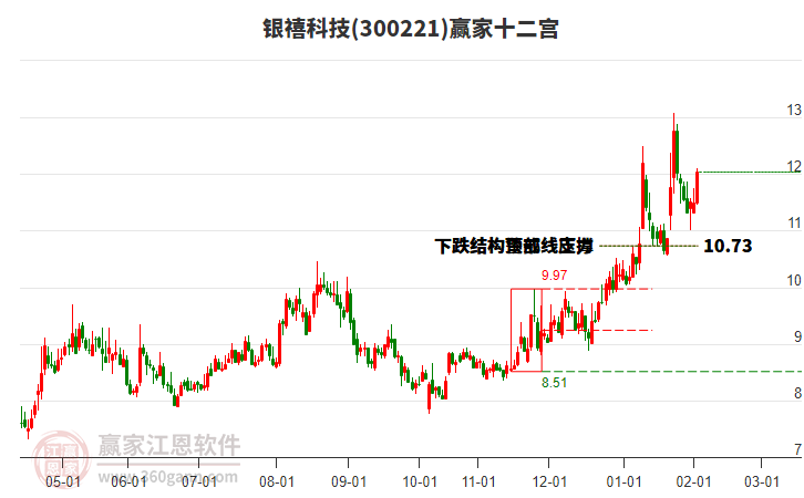 300221銀禧科技近期高點(diǎn)13.09持續(xù)下跌,漲幅回落13.83%,受贏家十二宮上漲結(jié)構(gòu)警戒線支撐