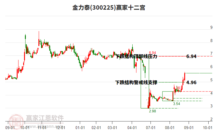 300225*ST金泰處于贏家江恩空頭主線形態(tài),從1月13日形成頂分型后持續(xù)下跌,今日形成短期初次筑頂信號(hào),短期多頭趨勢(shì)已被破壞,中長線均在空頭下跌趨勢(shì)中。300225*ST金泰根據(jù)贏家江恩極反通道趨