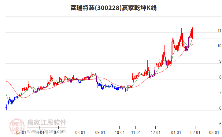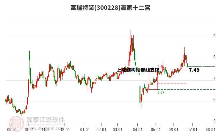 目前300228富瑞特裝最高價9.58上穿了贏家極反通道工具藍色外軌線,受到藍色外軌線強力壓制,最終收盤停留在在藍色外軌線與生命線上方的強勢通道區(qū)域。300228富瑞特裝近10個交易日漲幅11.59%