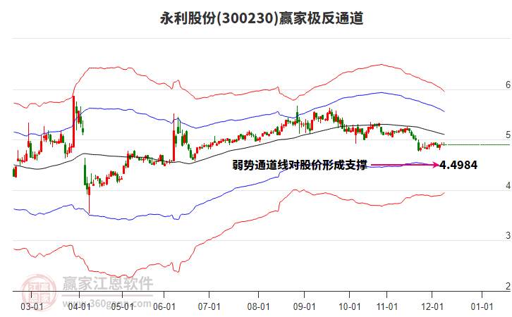 依據(jù)贏家江恩系統(tǒng)趨勢工具極反通道分析判斷永利股份300230運行在生命線以下弱勢區(qū)域,根據(jù)規(guī)則該股短線輕倉參與,股價跌至弱勢外軌線后波段再結(jié)合其它工具信號建倉。應(yīng)用口訣是:生命線上強勢走,生命線下難抬頭;紅黃兩條外軌線,壓力支撐顯勢頭。