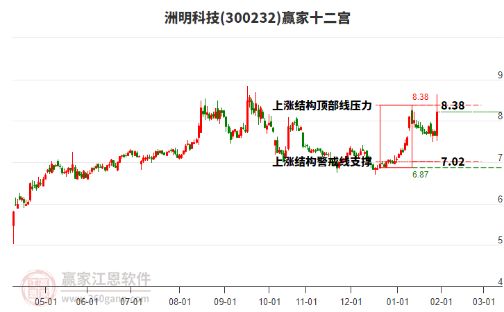 2月13日K線微跌0.74%,目前受到23日前形成的上漲結(jié)構(gòu)頂部線8.38壓制,本輪自前方低點2月6日7.43元,上漲至今日已持續(xù)5日,多方能量得到釋放,空方能量逐漸增強。依據(jù)贏家十二宮結(jié)構(gòu)規(guī)則,股價若不能有效突破站穩(wěn)上漲結(jié)構(gòu)頂部線,多方能量逐漸衰竭,空方能量逐漸主導(dǎo),向下方警戒線7.02位置附近尋找新的平衡位。若向上突破站穩(wěn)頂部線8.38,有望突破前期形成的高點。