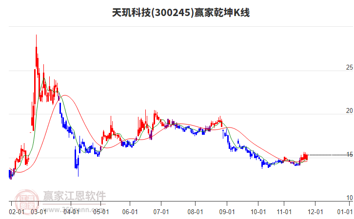 天璣科技(300245)處于贏家江恩多頭中期回調(diào)形態(tài),從11月3日形成頂分型后持續(xù)下跌,重心下移,今日跌破前低形成短期初次筑頂信號,短期多頭趨勢已被破壞,中期多頭反彈趨勢延續(xù),但長期處于回調(diào)中。天璣科