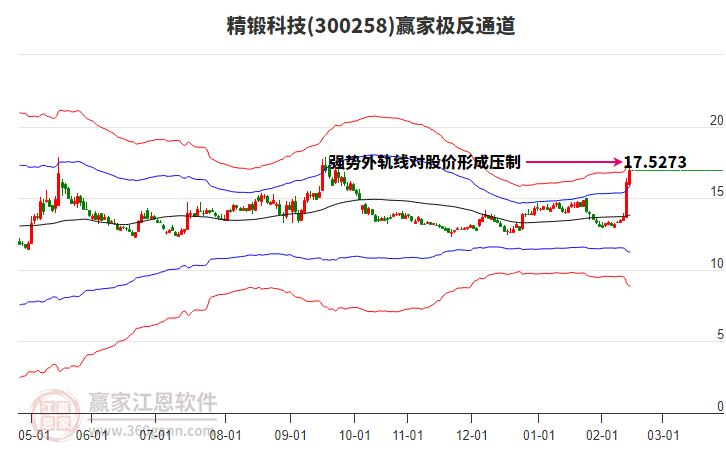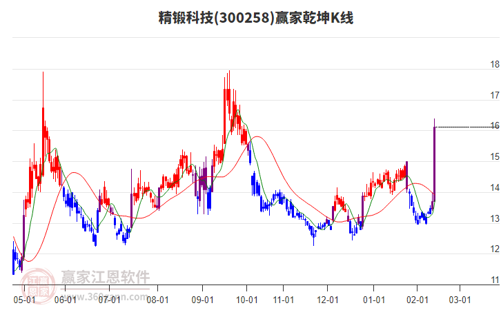 精鍛科技300258低開(kāi)收穿頭破腳大陽(yáng)線,等距時(shí)間周期線顯示近期時(shí)間窗2月19日