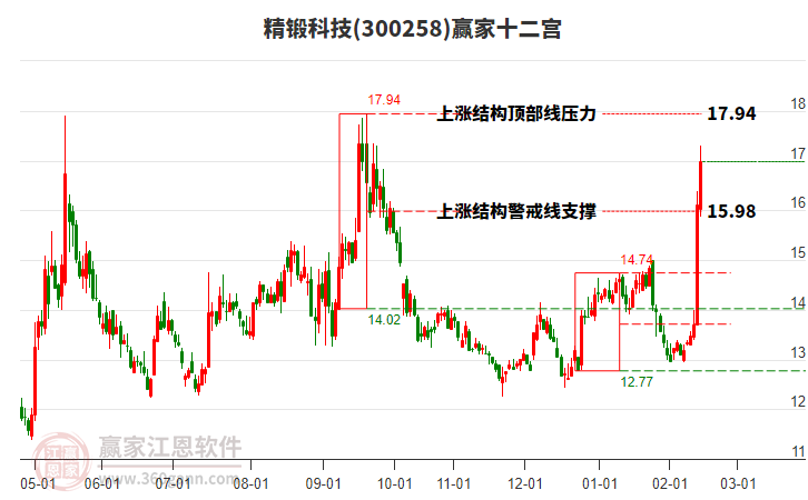 2月13日K線小幅上漲5.52%,目前受到98日前形成的上漲結(jié)構(gòu)頂部線17.94壓制,本輪自前方低點(diǎn)2月6日12.94元,上漲至今日已持續(xù)5日,多方能量得到釋放,空方能量逐漸增強(qiáng)。依據(jù)贏家十二宮結(jié)構(gòu)規(guī)則,股價(jià)若不能有效突破站穩(wěn)上漲結(jié)構(gòu)頂部線,多方能量逐漸衰竭,空方能量逐漸主導(dǎo),向下方警戒線15.98位置附近尋找新的平衡位。若向上突破站穩(wěn)頂部線17.94,有望突破前期形成的高點(diǎn)。