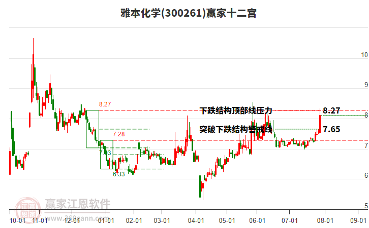 依據(jù)贏家江恩系統(tǒng)趨勢工具極反通道分析判斷雅本化學(xué)300261運行在生命線以下弱勢區(qū)域,根據(jù)規(guī)則該股短線輕倉參與,股價跌至弱勢外軌線后波段再結(jié)合其它工具信號建倉。應(yīng)用口訣是:生命線上強勢走,生命線下難抬頭;紅黃兩條外軌線,壓力支撐顯勢頭。