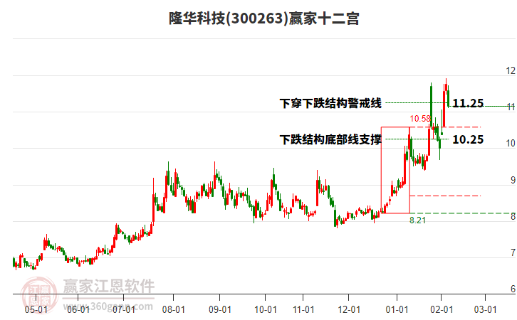 當(dāng)前股價(jià)位于前期2021年12月7日形成的下跌結(jié)構(gòu)頂部線12.26與警戒線11.25之間,今日小幅下跌4.56%,以11.5元小陰線收盤。依據(jù)贏家十二宮多空能量守恒規(guī)則,下跌結(jié)構(gòu)警戒線是多空能量平衡爭(zhēng)奪點(diǎn),突破或跌破往往意味著平衡打破。當(dāng)前股價(jià)若能站穩(wěn)警戒線位置,多方能量有望主導(dǎo)上攻,向上頂部線位置尋找多空能量平衡位。如股價(jià)不能有效站穩(wěn)警戒線,則空方能量主導(dǎo)下探,向底部線附近尋找新的多空能量平衡位。