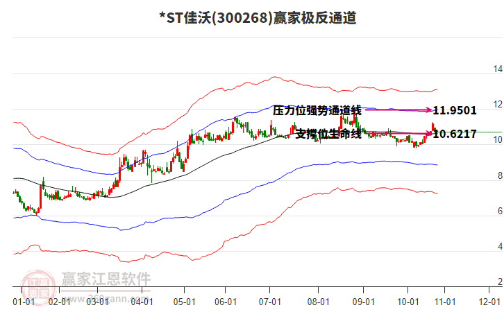 依據(jù)贏(yíng)家江恩系統(tǒng)趨勢(shì)工具極反通道分析判斷ST佳沃300268運(yùn)行在生命線(xiàn)以下弱勢(shì)區(qū)域,根據(jù)規(guī)則該股短線(xiàn)輕倉(cāng)參與,股價(jià)跌至弱勢(shì)外軌線(xiàn)后波段再結(jié)合其它工具信號(hào)建倉(cāng)。應(yīng)用口訣是:生命線(xiàn)上強(qiáng)勢(shì)走,生命線(xiàn)下難抬頭;紅黃兩條外軌線(xiàn),壓力支撐顯勢(shì)頭。