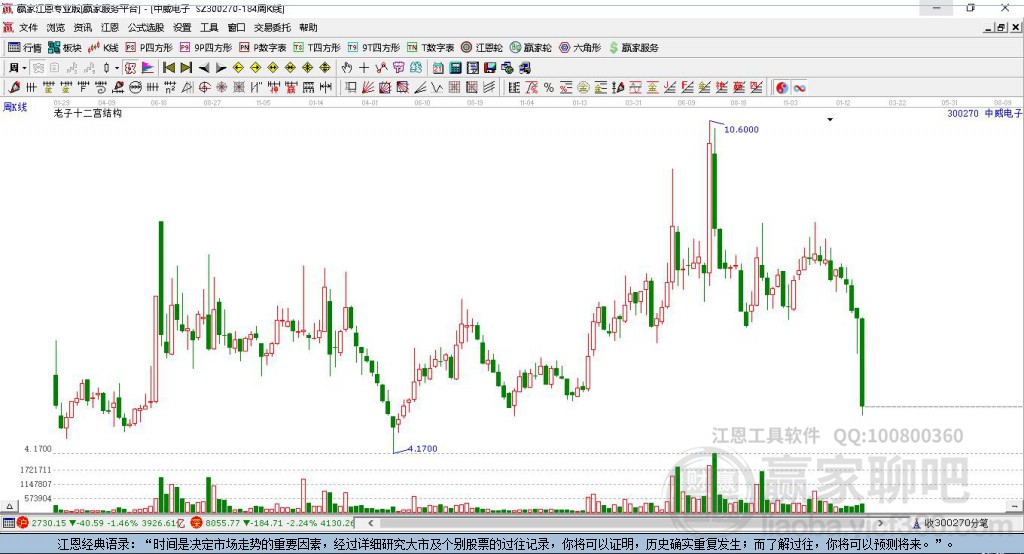 300270中威電子處于贏家江恩多頭中期回調(diào)形態(tài),1月6日發(fā)出江恩筑底信號后,經(jīng)過23日,今日形成短期筑頂信號,短期多頭趨勢已被破壞,中期雖然處于下跌中,但長期多頭趨勢延續(xù)。300270中威電子根據(jù)贏