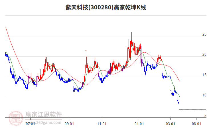 300280紫天科技低開收陽線,受贏家十二宮上漲結(jié)構(gòu)底部線壓制