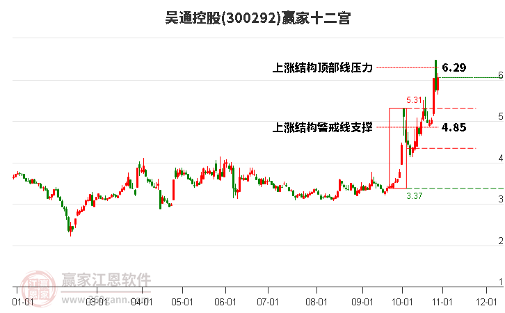 依據(jù)贏家江恩系統(tǒng)趨勢工具極反通道分析判斷吳通控股300292運行在生命線以上強勢區(qū)域,根據(jù)規(guī)則該股可短線、波段結(jié)合操作;結(jié)合物極必反的原理通過分鐘圖做盤中差價,應(yīng)用口訣是:生命線上強勢走,生命線下難抬頭;紅黃兩條外軌線,壓力支撐顯勢頭。