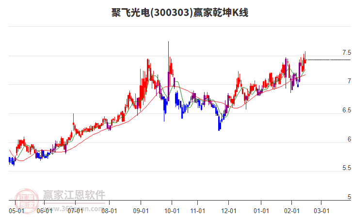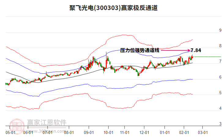 300303聚飛光電根據(jù)贏家江恩極反通道趨勢(shì)工具展示,上方壓力位7.8196,下方支撐位7.0296。300303聚飛光電處于贏家江恩多頭主線形態(tài),從1月30日形成底分型后持續(xù)上攻,今日突破前高形成初