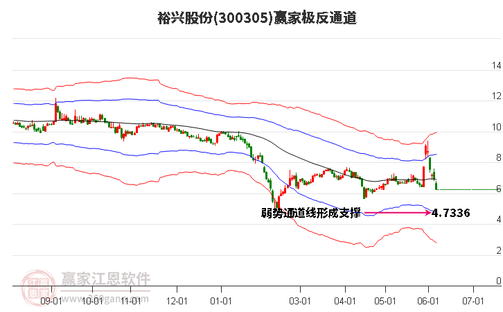 依據(jù)贏家江恩系統(tǒng)趨勢(shì)工具極反通道分析判斷裕興股份300305運(yùn)行在生命線以下弱勢(shì)區(qū)域,根據(jù)規(guī)則該股短線輕倉(cāng)參與,股價(jià)跌至弱勢(shì)外軌線后波段再結(jié)合其它工具信號(hào)建倉(cāng)。應(yīng)用口訣是:生命線上強(qiáng)勢(shì)走,生命線下難抬頭;紅黃兩條外軌線,壓力支撐顯勢(shì)頭。