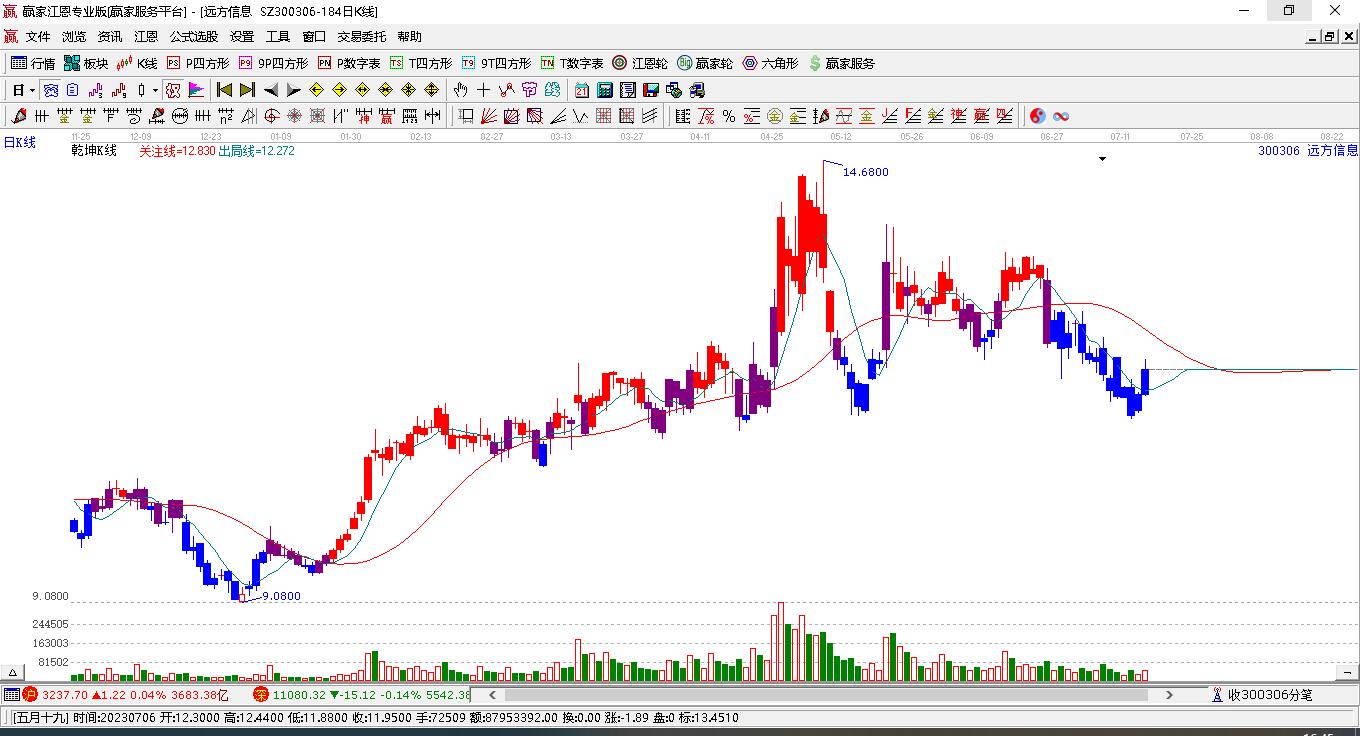 300306遠(yuǎn)方信息處于贏家江恩多頭次主線形態(tài),從11月27日形成頂分型后持續(xù)下跌,重心下移,今日跌破前低形成短期初次筑頂信號(hào),短期多頭趨勢(shì)已被破壞,中長(zhǎng)期多頭趨勢(shì)依舊保持。300306遠(yuǎn)方信息根據(jù)贏