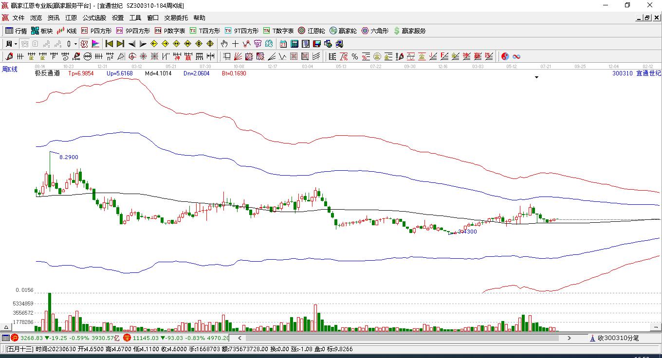 300310宜通世紀(jì)根據(jù)贏家江恩極反通道趨勢工具展示,上方壓力位6.9066,下方支撐位6.0524。300310宜通世紀(jì)處于贏家江恩空頭主線形態(tài),從11月26日形成頂分型后持續(xù)下跌,今日形成短期初次