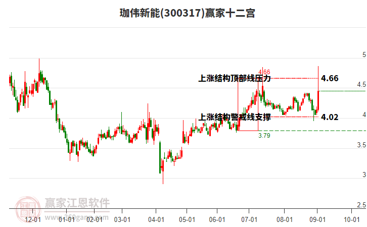 300317珈偉新能處于贏家江恩多頭主線形態(tài),今日重心上移,短期持續(xù)上漲,從12月17日形成中期底分型后,行情經(jīng)歷一波上漲,突破前高形成中期初次筑底信號,長期處于多頭上漲趨勢。300317珈偉新能根據(jù)