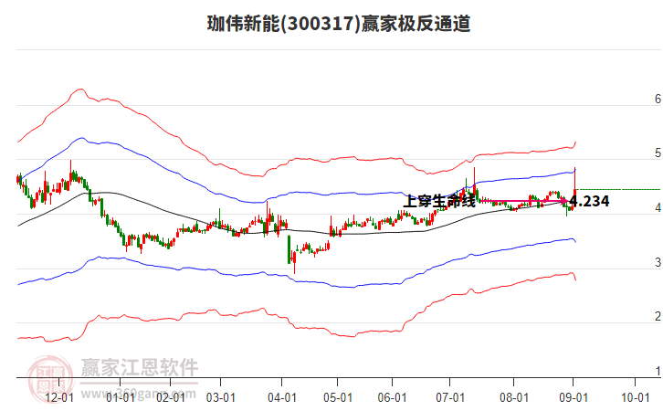 依據(jù)贏家江恩系統(tǒng)趨勢工具極反通道分析判斷珈偉新能300317運(yùn)行在生命線以下弱勢區(qū)域,根據(jù)規(guī)則該股短線輕倉參與,股價(jià)跌至弱勢外軌線后波段再結(jié)合其它工具信號建倉。應(yīng)用口訣是:生命線上強(qiáng)勢走,生命線下難抬頭;紅黃兩條外軌線,壓力支撐顯勢頭。