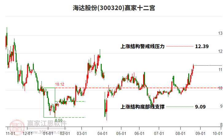 1月23日海達股份最高價10.85挑戰(zhàn)了贏家極反通道工具藍色外軌線,受到藍色外軌線強力壓制,最終收盤停留在在藍色外軌線與生命線上方的強勢通道區(qū)域。海達股份近10個交易日漲幅11.31%。