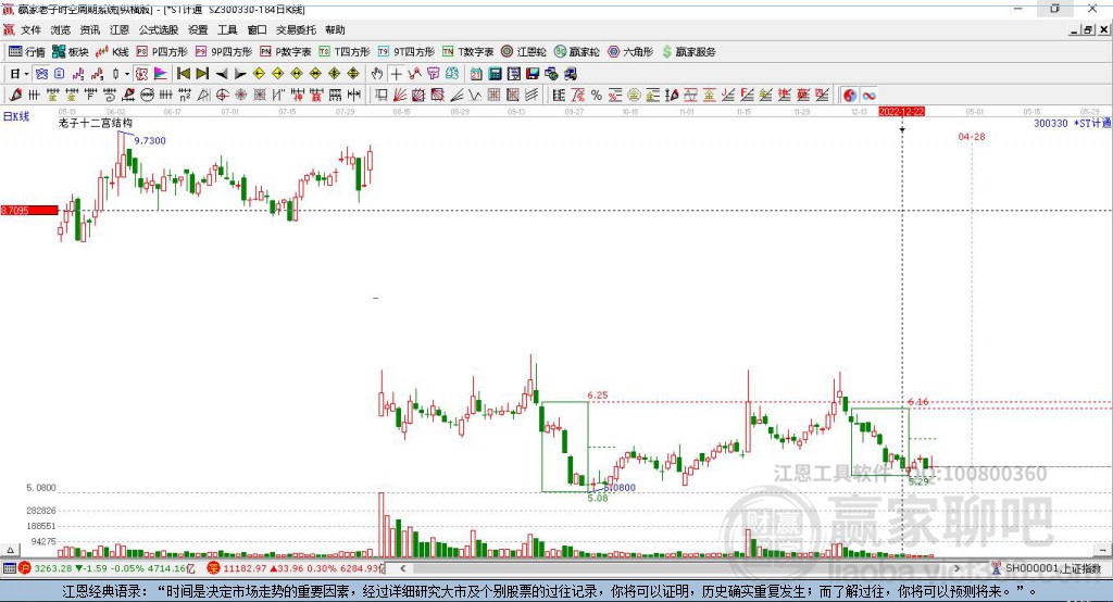 依據(jù)贏家江恩系統(tǒng)趨勢工具極反通道分析判斷*ST計(jì)通300330運(yùn)行在生命線以下弱勢區(qū)域,根據(jù)規(guī)則該股短線輕倉參與,股價(jià)跌至弱勢外軌線后波段再結(jié)合其它工具信號(hào)建倉。應(yīng)用口訣是:生命線上強(qiáng)勢走,生命線下難抬頭;紅黃兩條外軌線,壓力支撐顯勢頭。