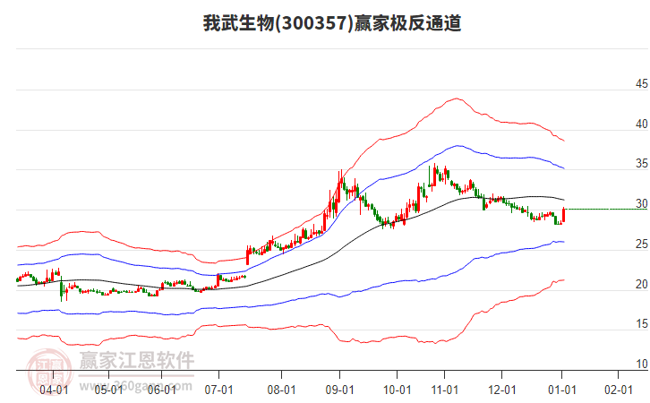 依據(jù)贏家江恩系統(tǒng)趨勢工具極反通道分析判斷我武生物300357運行在生命線以下弱勢區(qū)域,根據(jù)規(guī)則該股短線輕倉參與,股價跌至弱勢外軌線后波段再結(jié)合其它工具信號建倉。應(yīng)用口訣是:生命線上強勢走,生命線下難抬頭;紅黃兩條外軌線,壓力支撐顯勢頭。