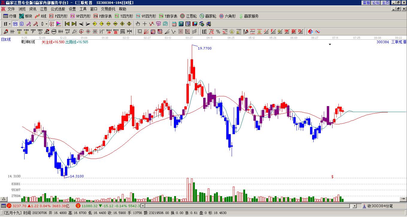 300384三聯(lián)虹普處于贏家江恩多頭中期回調(diào)形態(tài),從11月24日形成底分型后持續(xù)上攻,今日突破前高形成初次江恩筑底信號(hào),中長(zhǎng)線均在空頭下跌趨勢(shì)中。300384三聯(lián)虹普根據(jù)贏家江恩極反通道趨勢(shì)工具展示,