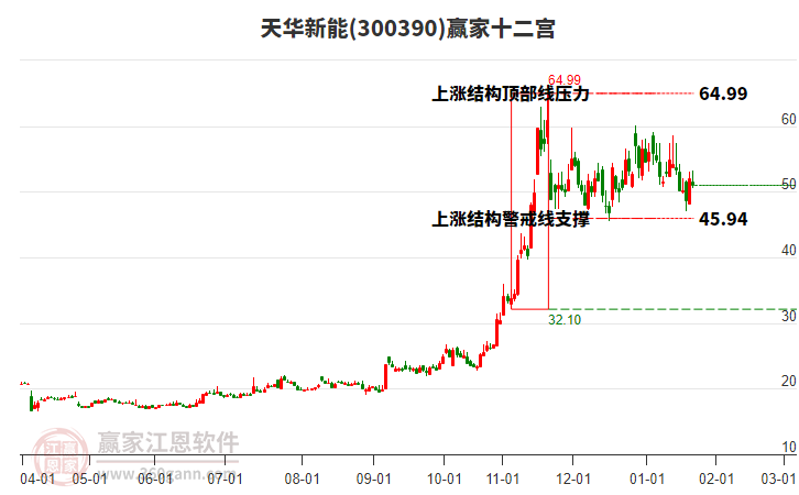 依據(jù)贏家江恩系統(tǒng)趨勢工具極反通道分析判斷天華新能300390運行在生命線以下弱勢區(qū)域,根據(jù)規(guī)則該股短線輕倉參與,股價跌至弱勢外軌線后波段再結(jié)合其它工具信號建倉。應(yīng)用口訣是:生命線上強勢走,生命線下難抬頭;紅黃兩條外軌線,壓力支撐顯勢頭。