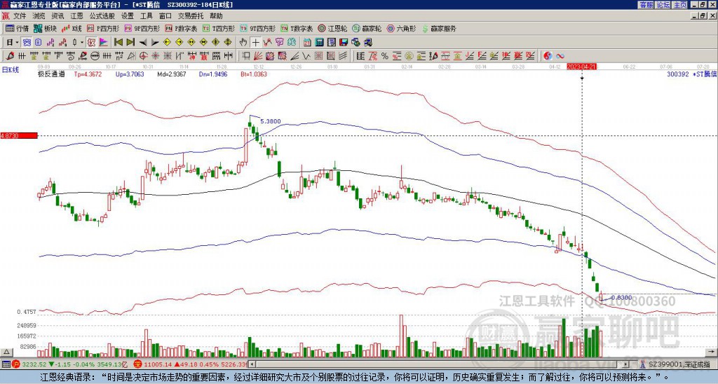 依據(jù)贏家江恩系統(tǒng)趨勢工具極反通道分析判斷*ST騰信300392運行在生命線以下弱勢區(qū)域,根據(jù)規(guī)則該股短線輕倉參與,股價跌至弱勢外軌線后波段再結(jié)合其它工具信號建倉。應(yīng)用口訣是:生命線上強勢走,生命線下難抬頭;紅黃兩條外軌線,壓力支撐顯勢頭。