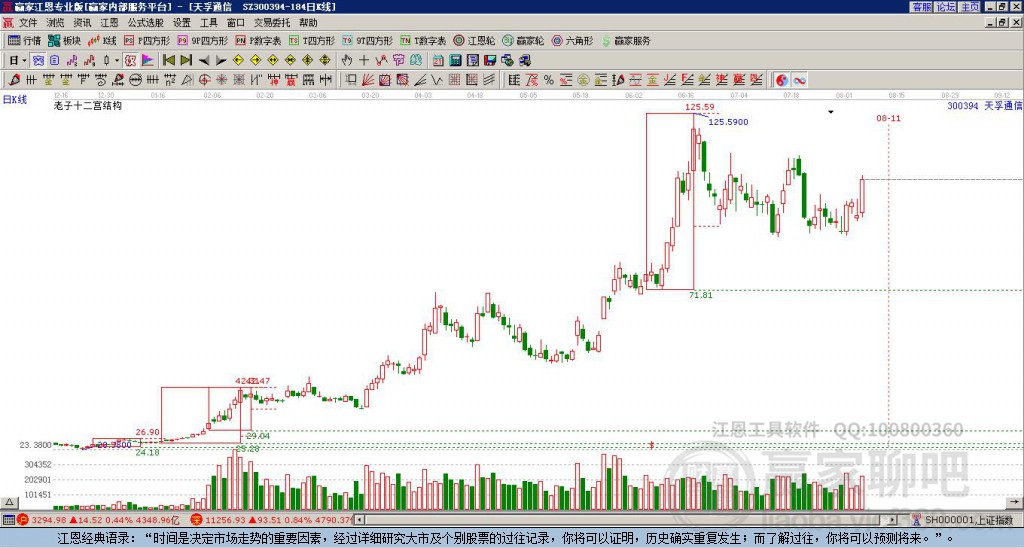 300394天孚通信目前漲停,所屬板塊通信設備、CPO、量子計算、5G、寬帶中國短期底分型后持續(xù)上攻。300394天孚通信截止目前突破極反通道強勢通道線,根據(jù)贏家江恩極反通道趨勢工具展示,上方壓力位3