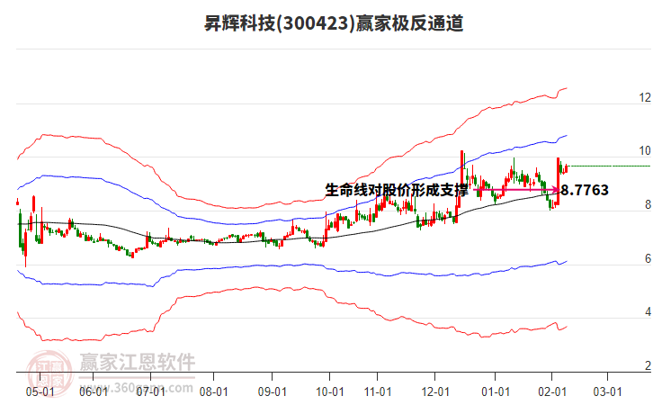 依據(jù)贏家江恩系統(tǒng)趨勢工具極反通道分析判斷昇輝科技300423運行在生命線以下弱勢區(qū)域,根據(jù)規(guī)則該股短線輕倉參與,股價跌至弱勢外軌線后波段再結(jié)合其它工具信號建倉。應用口訣是:生命線上強勢走,生命線下難抬頭;紅黃兩條外軌線,壓力支撐顯勢頭。