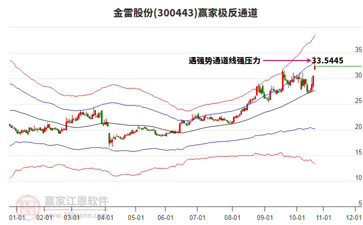 依據(jù)贏家江恩系統(tǒng)趨勢工具極反通道分析判斷金雷股份300443運行在生命線以下弱勢區(qū)域,根據(jù)規(guī)則該股短線輕倉參與,股價跌至弱勢外軌線后波段再結合其它工具信號建倉。應用口訣是:生命線上強勢走,生命線下難抬頭;紅黃兩條外軌線,壓力支撐顯勢頭。