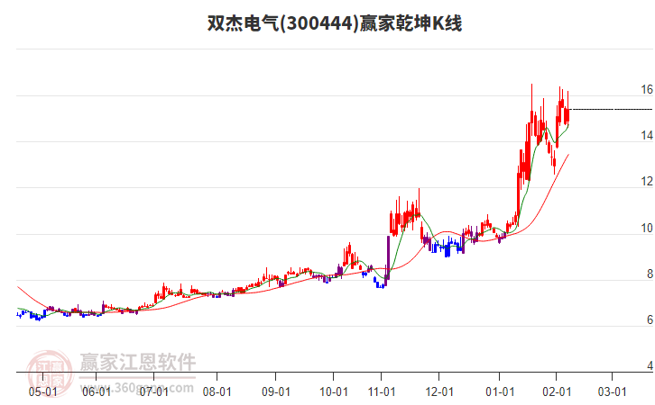 雙杰電氣300444低開收陽線,上穿江恩價格百分比工具關(guān)鍵點位15.54元
