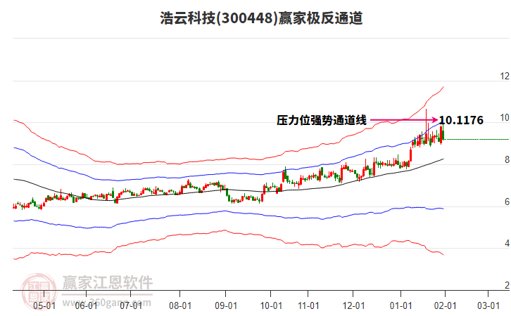 當(dāng)天300448浩云科技最高價(jià)10.64上穿了贏家極反通道工具藍(lán)色外軌線,受到藍(lán)色外軌線強(qiáng)力壓制,最終收盤停留在在藍(lán)色外軌線與生命線上方的強(qiáng)勢通道區(qū)域。300448浩云科技近10個(gè)交易日漲幅16.61