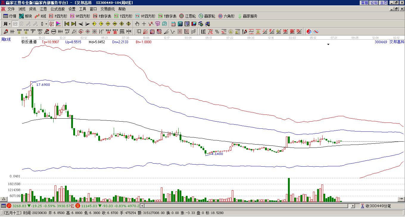 漢邦高科目前漲停,所屬板塊知識產(chǎn)權(quán)發(fā)出多頭預(yù)警信號,數(shù)字水印、IT設(shè)備、智慧城市短期底分型后持續(xù)上攻。漢邦高科截止目前突破極反通道強勢通道線,根據(jù)贏家江恩極反通道趨勢工具展示,上方壓力位9.4692,