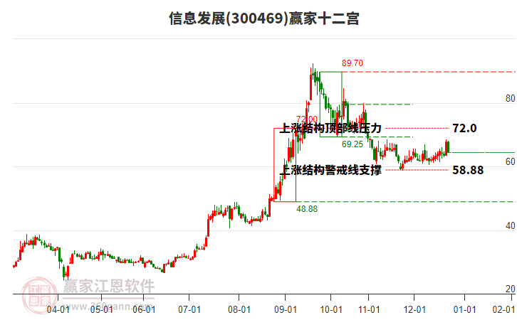 300469信息發(fā)展處于贏家江恩多頭次主線形態(tài),從1月13日形成頂分型后持續(xù)下跌,重心下移,今日跌破前低形成短期初次筑頂信號,短期多頭趨勢已被破壞,中期多頭趨勢延續(xù),但長期處于回調(diào)中。300469信息