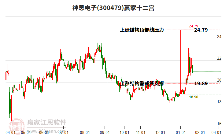 該股自近期低點19.68,漲至今日21.89,共上漲2.21元,漲幅11.23%,當前股價處于2026年1月15日形成的上漲結(jié)構(gòu)頂部線與警戒線之間。依據(jù)贏家十二宮多空能量守恒規(guī)則,若多方能量再度聚集發(fā)力上攻,有望繼續(xù)上攻關(guān)注結(jié)構(gòu)頂部線24.79尋找平衡位。