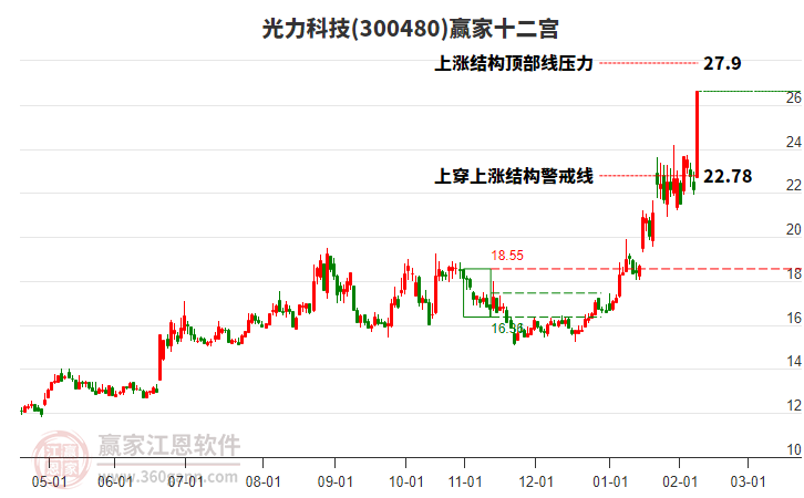 2月13日走勢(shì)完成上漲結(jié)構(gòu),今日股價(jià)以28.0收盤(pán),微跌0.81%,股價(jià)自近期低點(diǎn)漲至今日,共上漲9.95元,漲幅55.12%,依據(jù)贏家十二宮能量守恒規(guī)則,上漲結(jié)構(gòu)的形成往往意味著短期上漲能量出現(xiàn)衰竭點(diǎn) 。當(dāng)前股價(jià)若能有效突破站穩(wěn)上漲結(jié)構(gòu)頂部線,后市有望繼續(xù)走高,若不能站上頂部線,則后市將會(huì)向下至警戒線附近尋找新的支撐。