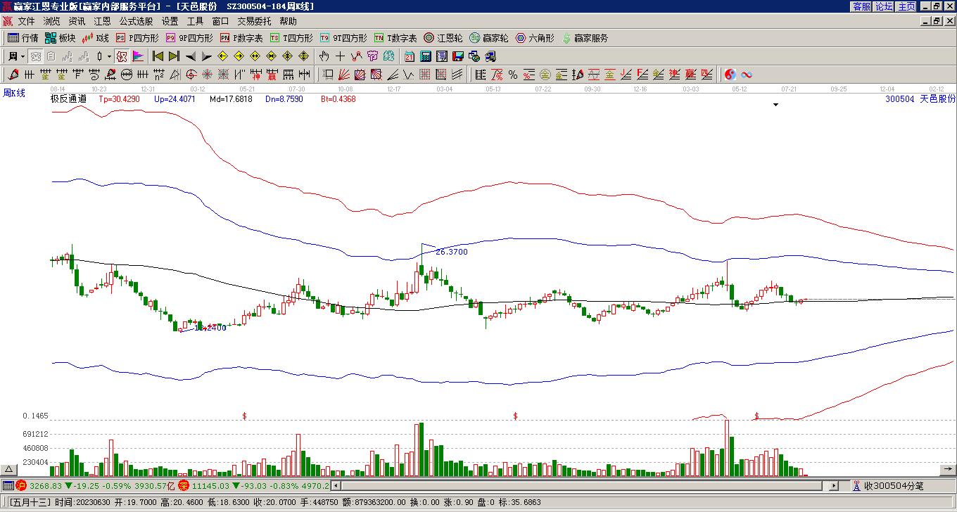 300504天邑股份根據(jù)贏家江恩極反通道趨勢工具展示,上方壓力位15.6161,下方支撐位14.2117。300504天邑股份處于贏家江恩多頭主線形態(tài),今日重心持續(xù)下移,短期延續(xù)下跌趨勢,長期發(fā)出江恩
