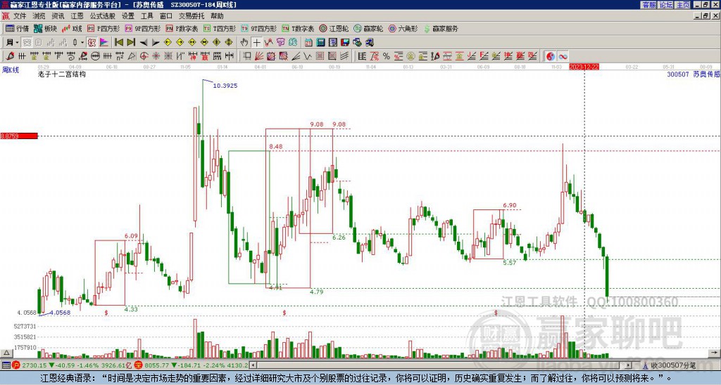 300507蘇奧傳感處于贏家江恩多頭中期回調(diào)形態(tài),今日重心上移,形成底分型,9月15日發(fā)出中期江恩筑底信號(hào)后,經(jīng)過(guò)98日,今日形成中期筑頂信號(hào),若持續(xù)下跌,觸發(fā)長(zhǎng)期筑頂信號(hào),300507蘇奧傳感將轉(zhuǎn)為
