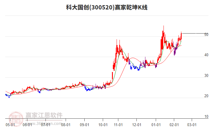 科大國創(chuàng)(300520)在高點55.26后,回調(diào)了10.46元,目前處于上行趨勢