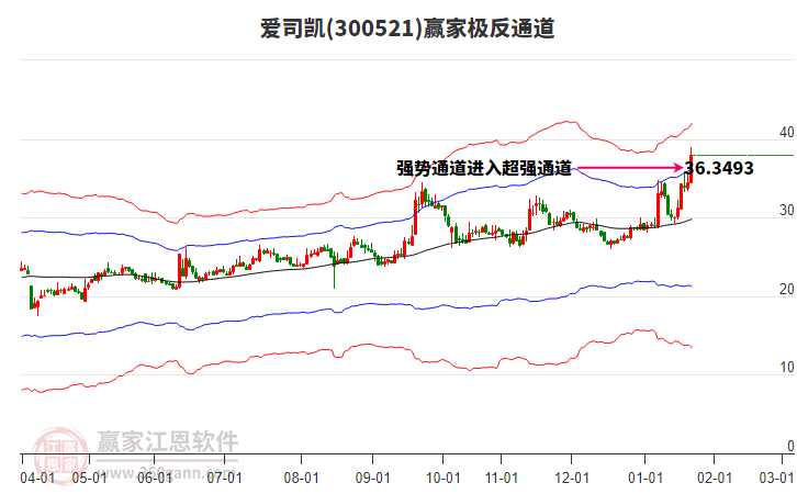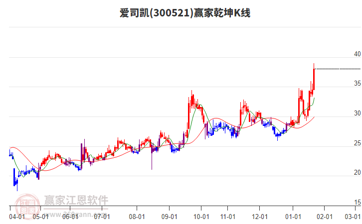 目前愛司凱最高價34.8上穿了贏家極反通道工具藍色外軌線,受到藍色外軌線強力壓制,最終收盤停留在在藍色外軌線與生命線上方的強勢通道區(qū)域。愛司凱近10個交易日漲幅19.24%。