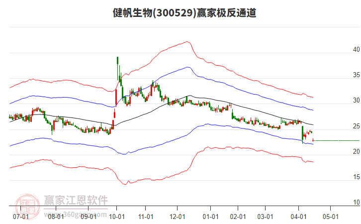 依據(jù)贏家江恩系統(tǒng)趨勢工具極反通道分析判斷健帆生物300529運行在生命線以下弱勢區(qū)域,根據(jù)規(guī)則該股短線輕倉參與,股價跌至弱勢外軌線后波段再結合其它工具信號建倉。應用口訣是:生命線上強勢走,生命線下難抬頭;紅黃兩條外軌線,壓力支撐顯勢頭。