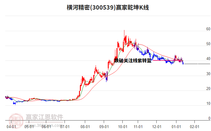 300539橫河精密從高點(diǎn)44.07,持續(xù)回調(diào)了9天,進(jìn)入乾坤K線藍(lán)色下跌趨勢