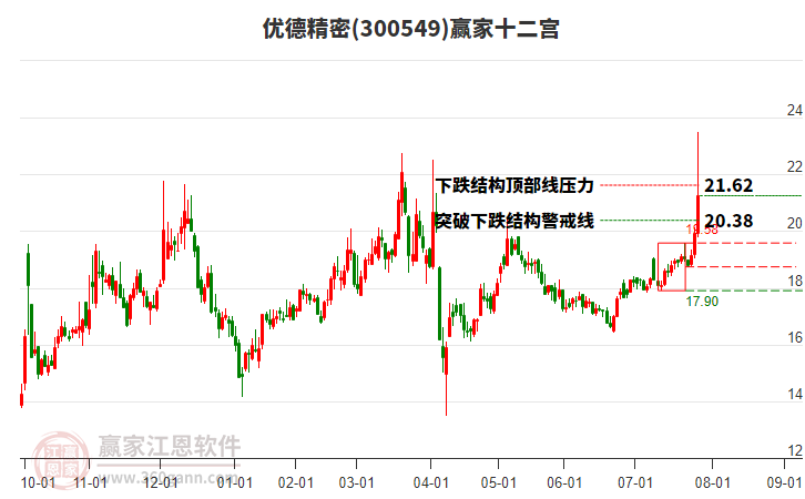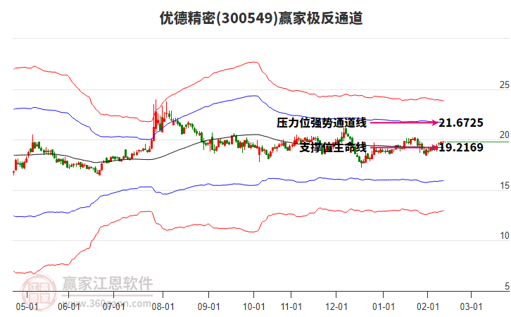 300549優(yōu)德精密根據(jù)贏家江恩極反通道趨勢(shì)工具展示,上方壓力位21.7478,下方支撐位19.2172。300549優(yōu)德精密處于贏家江恩多頭中期回調(diào)形態(tài),1月8日發(fā)出江恩筑頂信號(hào)后,經(jīng)過27日,今日