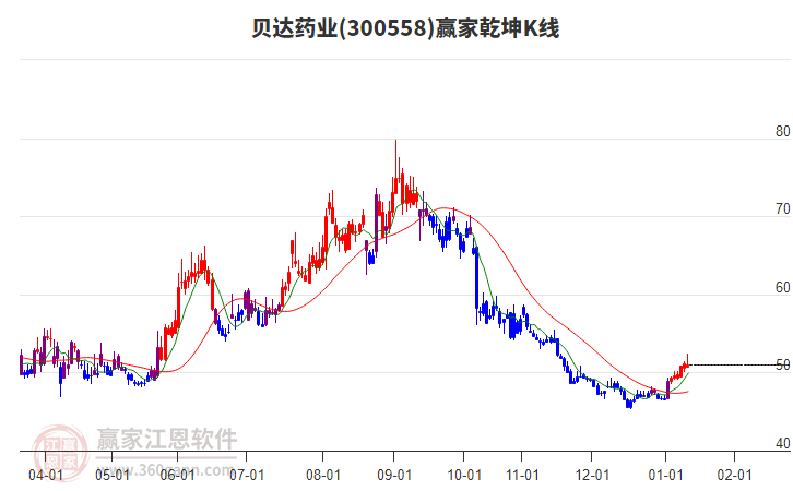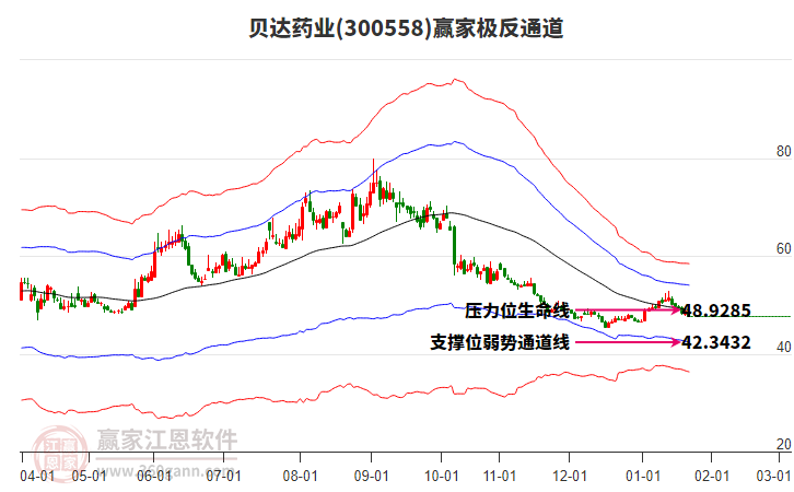 300558貝達(dá)藥業(yè)根據(jù)贏家江恩極反通道趨勢工具展示,上方壓力位48.3373,下方支撐位41.7424。300558貝達(dá)藥業(yè)處于贏家江恩空頭主線形態(tài),從1月14日形成頂分型后持續(xù)下跌,今日形成短期初
