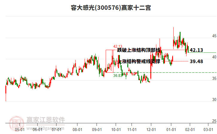 容大感光處于贏家江恩多頭次主線形態(tài),從12月15日形成頂分型后持續(xù)下跌,重心下移,今日跌破前低形成短期初次筑頂信號(hào),短期多頭趨勢(shì)已被破壞,中長(zhǎng)期多頭趨勢(shì)依舊保持。容大感光根據(jù)贏家江恩極反通道趨勢(shì)工具展