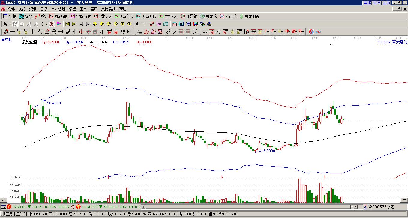 12月9日300576容大感光最高價43.44上穿了贏家極反通道工具藍色外軌線,受到藍色外軌線強力壓制,最終收盤停留在在藍色外軌線與生命線上方的強勢通道區(qū)域。300576容大感光近10個交易日漲幅16
