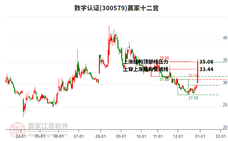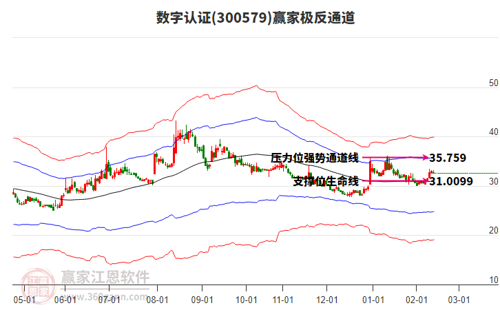 數(shù)字認(rèn)證根據(jù)贏家江恩極反通道趨勢工具展示,上方壓力位35.5786,下方支撐位30.8962。數(shù)字認(rèn)證處于贏家江恩多頭主線形態(tài),從2月2日形成底分型后持續(xù)上攻,今日突破前高形成初次江恩筑底信號,中期多