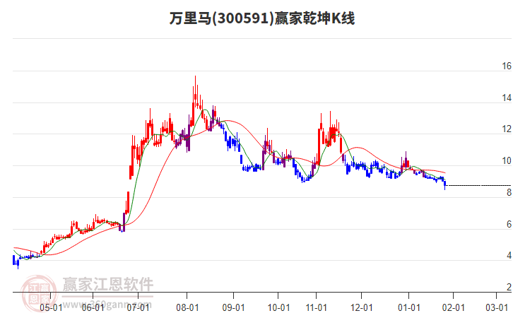 300591萬里馬處于贏家江恩多頭中期回調(diào)形態(tài),1月7日發(fā)出中期江恩筑底信號(hào)后,經(jīng)過6日,今日形成中期筑頂信號(hào),若持續(xù)下跌,觸發(fā)長期筑頂信號(hào),300591萬里馬將轉(zhuǎn)為空頭主線。300591萬里馬根據(jù)贏