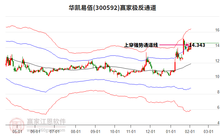 當天300592華凱易佰最高價14.44上穿了贏家極反通道工具藍色外軌線,受到藍色外軌線強力壓制,最終收盤停留在在藍色外軌線與生命線上方的強勢通道區(qū)域。300592華凱易佰近10個交易日漲幅12.79