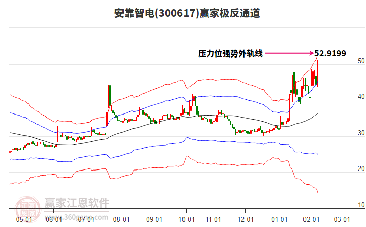 目前安靠智電300617最高價(jià)45.3上穿了贏家極反通道工具上方紅色外軌線,受到上方紅色外軌線強(qiáng)力壓制,最終收盤停留在在上方紅色外軌線與藍(lán)色外軌線上方的超強(qiáng)通道區(qū)域。安靠智電300617近10個(gè)交易日
